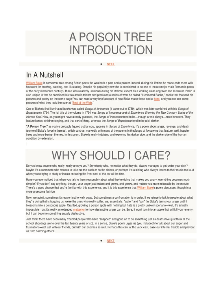 The poem reflects on the bitter effects of the suppressed feeling of enmity. The poems title announces its central metaphor. A Poison Trees plot summary It was initially published in Blakes Songs of Experience which was released in 1794.
